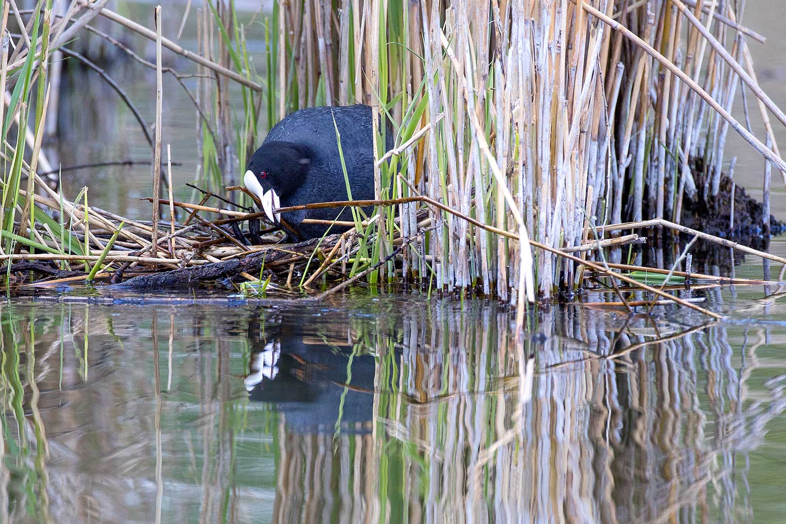 Etwas weniger farbenfroh, aber gleichfalls imposant, kommt das Blässhuhn daher. Hier emsig dabei „Baustoff“ für den Nestbau zu sammeln.